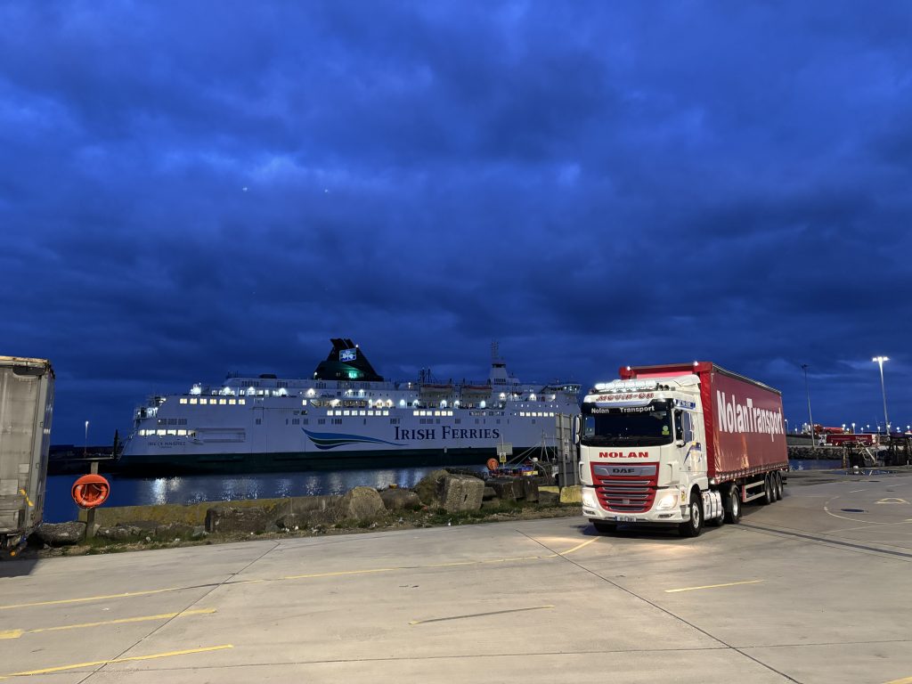 The Innisfree ship behind, a Nolan truck just arrived into Rosslare Ireland … and maybe a few Easter eggs on board 😉